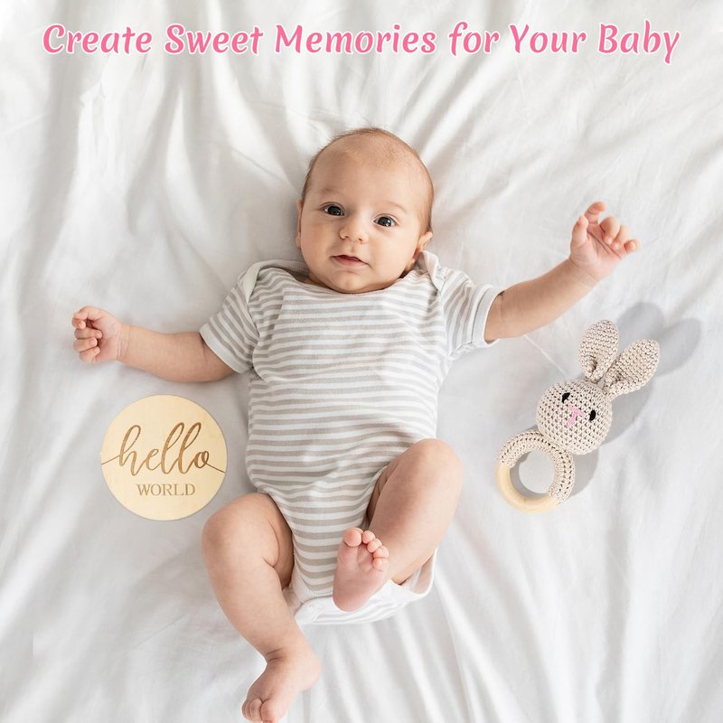 - 【SWEET MEMORIES GIFTS FOR MOM AND BABY】Surprise new parents with the best baby shower gift of a bunny lovey, the gentle rattle noise is perfect sensory stimulation for infants, it's sure to be baby's favorite shake toy. Pick a sweet and heartwarming milestone for your baby, engraved with elegant "Hello World", with your baby's personal message on the back, can be applied as the lovely photo props to take adorable and memorable photos for your little one