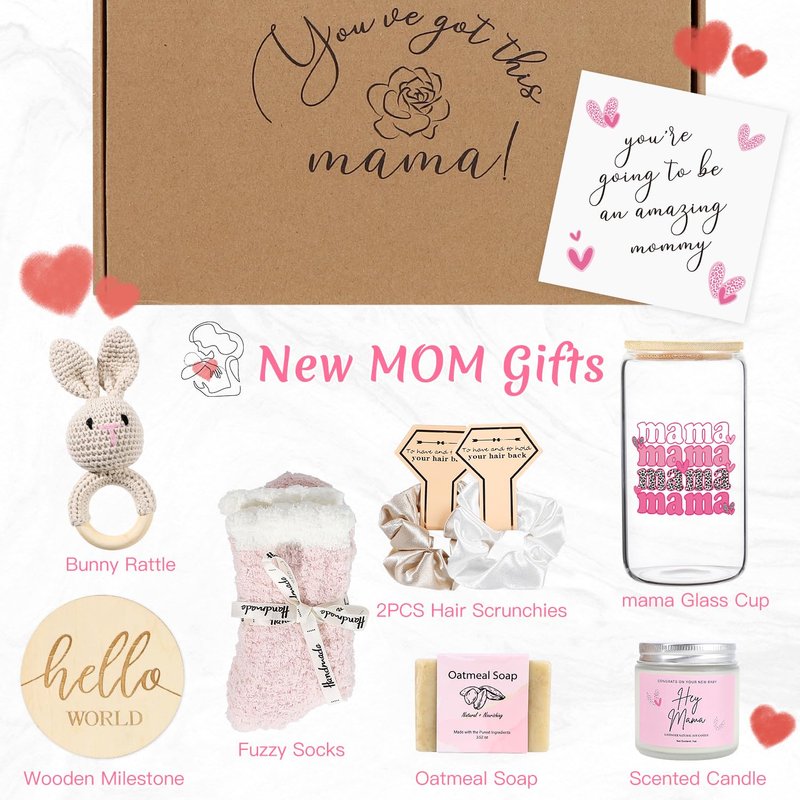 - 【UNIQUE NEW MOM GIFT BASKET】If you're looking for gift ideas to celebrate new moms and their incredible journey into motherhood, you can't go wrong with practical and thoughtful new mom gifts choices. This charming new mom gift box includes funny glass cup, bunny rattle, lavender scented candle, oatmeal soap, hair scrunchies, fuzzy socks, mileage card, greeting card. Whether it's a friend's baby shower gifts, or a new mom pampering gift for a loved one, sure to make her feel cherished and loved