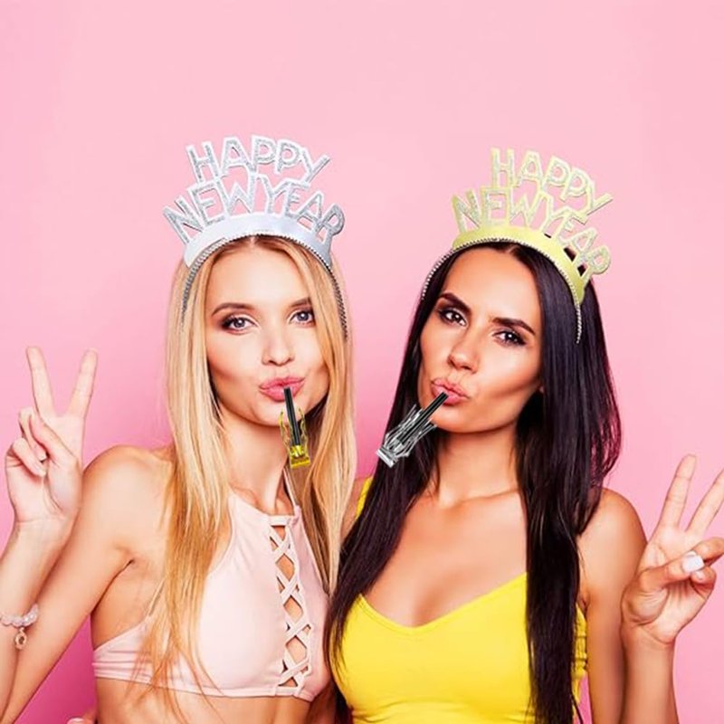 New Years Eve Party Supplies 2025-24 Pieces Gold Sliver Happy New Year Headband Metallic Fringed Noise Makers for Kids Adults New Years Party Supplies