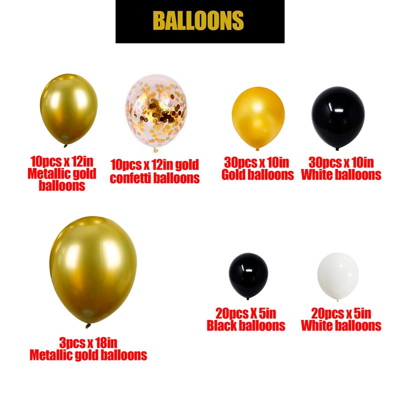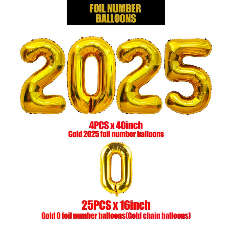 - 【NEW YEARS EVE PARTY SUPPLIES 2025】40in 2025 number foil balloons,5in black balloons(20pcs),5in white balloons(20pcs),10in black balloons(30pcs),10in gold balloons(30pcs),12in metallic gold balloons(10pcs),12in gold confetti balloons(10pcs),18in metallic gold balloons(3pcs),gold chain balloons(25pcs),foil fringe curtain(3pcs),gold sequined strips(10pcs).