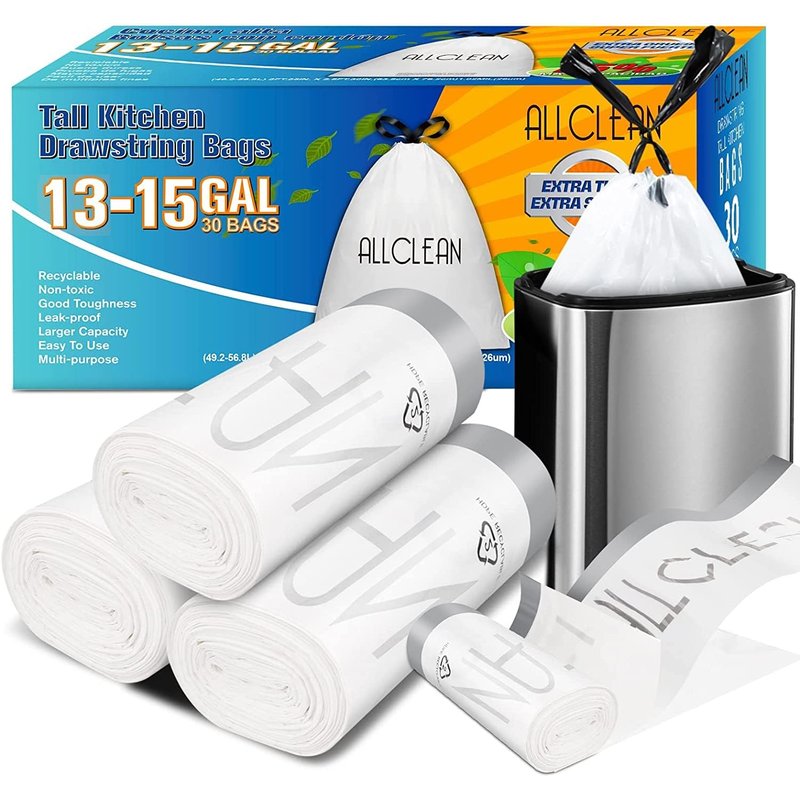 ALLCLEAN 13-15 Gallon Trash Bags,Tall Kitchen Garbage Bags Drawstring, Recyclable Trash Bags Unscented Trash Can Liners For Home Kitchen and Commercial (White 30 Count)