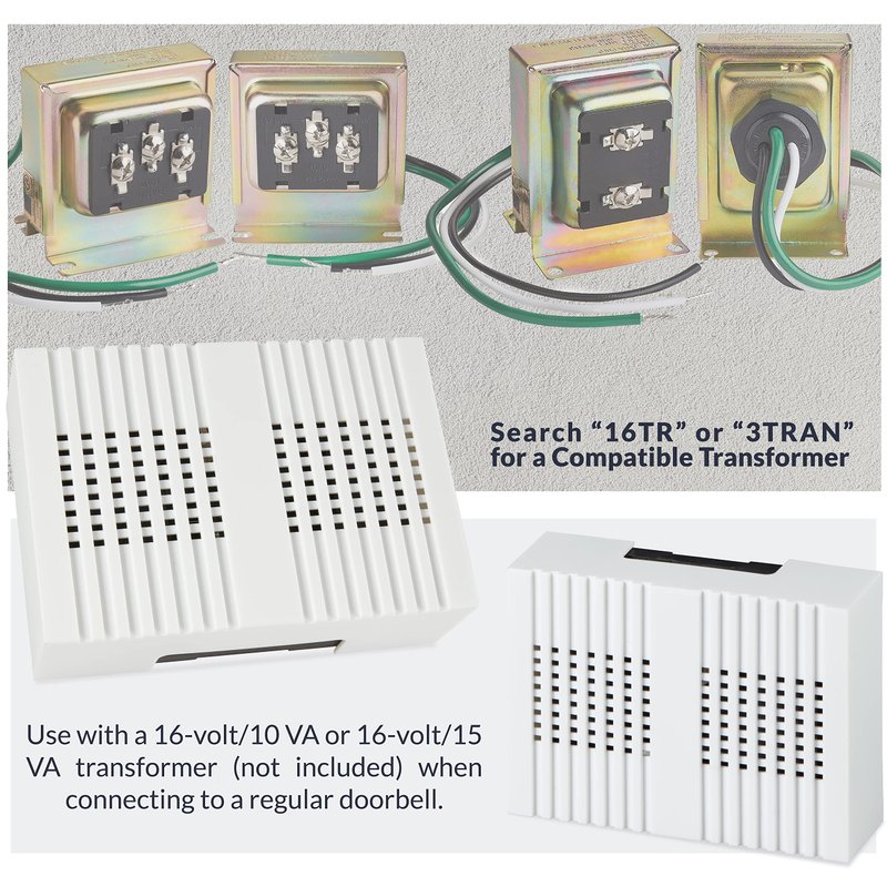 - COMPATIBILITY: Use with a 16-volt/10 VA or 16-volt/15 VA transformer (not included) when connecting to a regular doorbell. Search “16TR” or "3TRAN" for a compatible transformer.