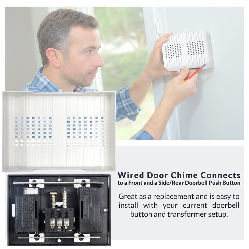- TWO SOUNDS: Classic two-note “Ding Dong” sound for the front door button and has an additional connection with a separate "Dong" for the rear or side door.