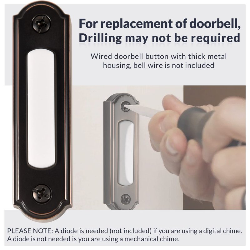 - EASY TO INSTALL: You can replace almost any door chime button . Our replacement wired doorbell buttons can use the same wiring as the old doorbell. Drilling may not be required (distance between the two screw holes is about 2.10 inches). Remember to add a diode (not included) for digital chimes (plays a melody; has a speaker for the sound).