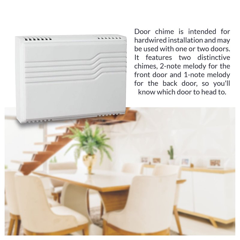 - Door chime is intended for hardwired installation and may be used with one or two doors. It features two distinctive chimes, 2-note melody for the front door and 1-note melody for the back door, so you'll know which door to head to.
