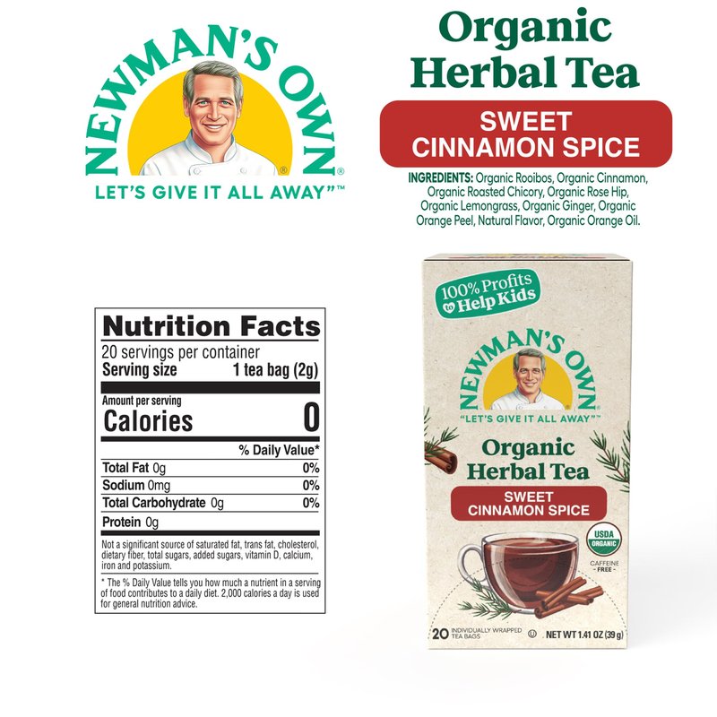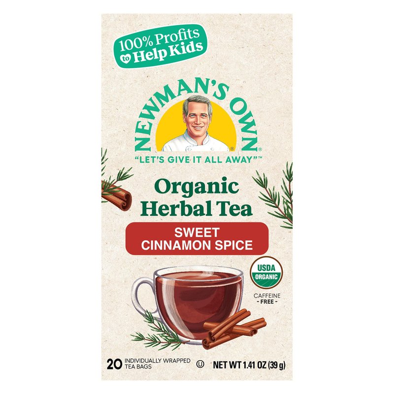 - ORGANIC SWEET CINNAMON SPICE TEA- Newman’s Own Organic Sweet Cinnamon Spice Herbal Tea blend has comforting flavors of cinnamon with a kick of ginger and sweetness notes of orange. This invigorating and aromatic herbal tea is made from organic ingredients.