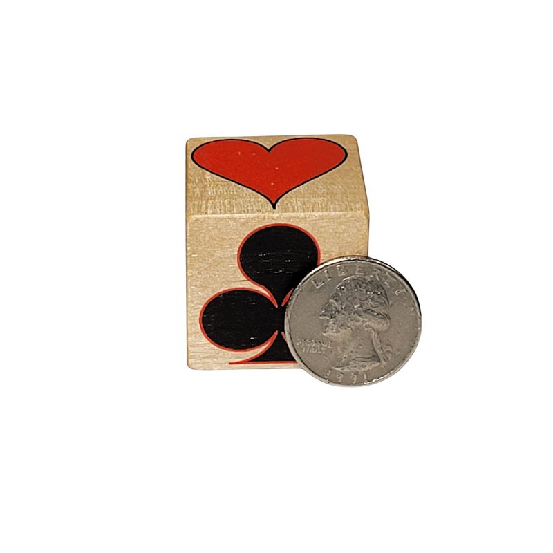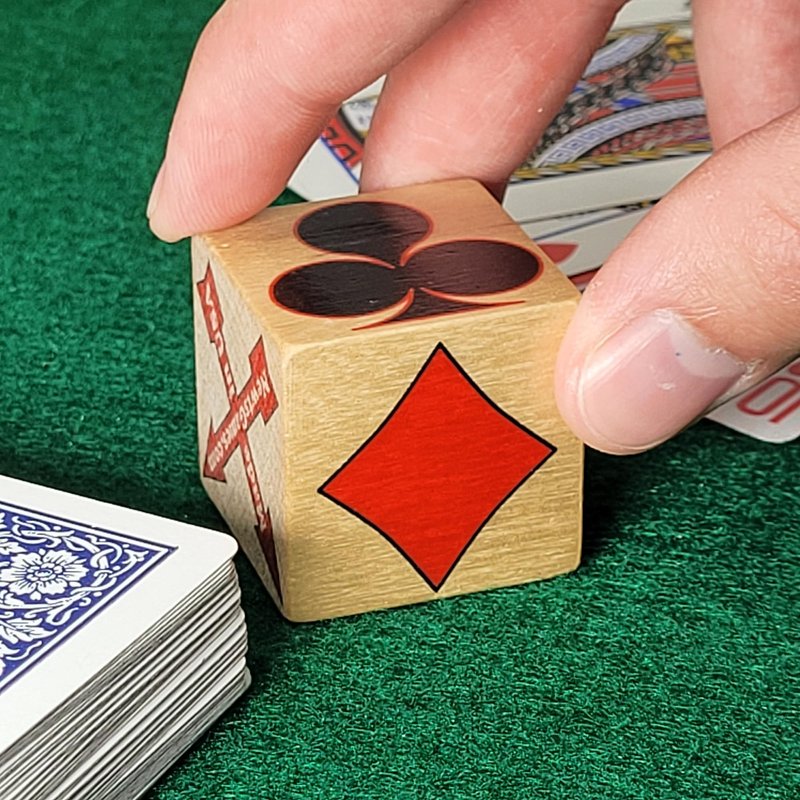After the block is prepared, we print the hearts, clubs, diamonds and spades as large as we can, directly onto the cube. Nope, these are NOT stickers. The printed design will not only last longer than stickers, but the artwork looks crisper. This also makes them easier to see from across the table, yet the block is small enough to set in the palm of your hand. Each block is coated with a water and scratch resistant spray to help preserve your new playing card accessory for many card game nights.