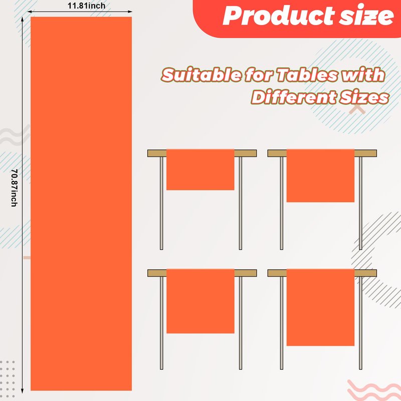Features: These table runners can be ideal gifts for your friends, family, neighbors, colleagues and so on, as housewarming gifts, wedding gifts and more. Our banquet table runners can not only be applied as table decorations to protect your table, but also as chair sashes, exquisite and delicate. Specifications: Material: polyesterColor: fluorescent green, fluorescent yellow, fluorescent pink and fluorescent orangeSize: about 70.87 x 11.81 inches/ 180 x 30 cmPackage includes: 8 x Party table runnersNotes: Manual measurement, please allow slight errors on size. The color may exist a slight difference due to different screen displays.