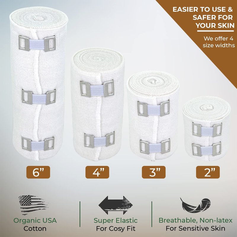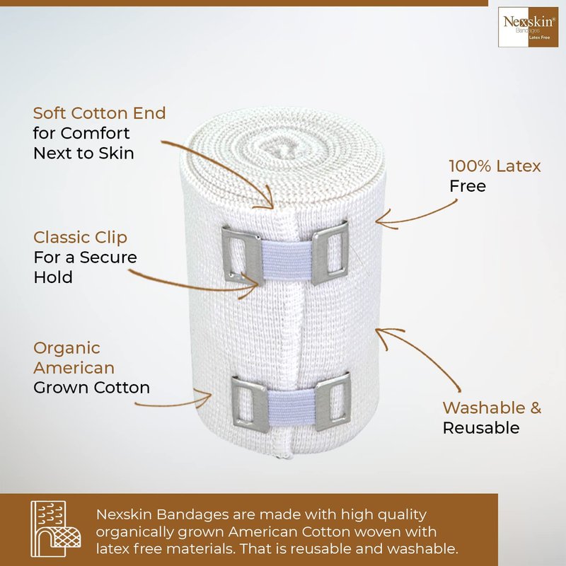 NexSkin 3 Inch Organic American Cotton elastic bandage with metal clips to provide secure closure and moderate compression. Our comfortable elastic wraps are made of latex free material to avoid any allergic reaction. The odor resistant fabric allows for extended use even during high intensity activities. The 2 metal clip fasteners keep the wrap secured in place for stability. Whether you're recovering from surgery, a sports injury, or require compression for daily wear, you can rely on NexSkin elastic bandages to support you. Add NexSkin soft woven bandages to your household first aid kit or athletic training supplies for relieving pain, joint support, or promoting healing.The custom fit compression wraps are ideal for prolonged wear and easy-to-use for wrapping an ankle, knee, thigh, foot, wrist, or other body part. Adjust the stretchy wrap to your desired tightness for providing pain relief and stability to a sprain, strain, or to promote circulation to your muscles. Our high quality NexSkin bandages are washable and can be reused for multiple wears.3 Inches Wide4 Pack13 - 15 Feet (Stretched)Latex FreeNonsterileMetal Clip FastenersBlended with Organic USA Pure Virgin Cotton Available in 2 Inch, 3 Inch, 4 Inch, and 6 Inch widths NexSkin Cotton Elastic Bandages