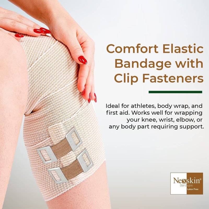 NexSkin 4 Inch American Cotton elastic bandage with metal clips to provide secure closure and moderate compression. Our comfortable elastic wraps are made of latex free material to avoid any allergic reaction. The odor resistant fabric allows for extended use even during high intensity activities. The 2 metal clip fasteners keep the wrap secured in place for stability. Whether you're recovering from surgery, a sports injury, or require compression for daily wear, you can rely on NexSkin elastic bandages to support you. Add NexSkin soft woven bandages to your household first aid kit or athletic training supplies for relieving pain, joint support, or promoting healing.The custom fit compression wraps are ideal for prolonged wear and easy-to-use for wrapping an ankle, knee, thigh, foot, wrist, or other body part. Adjust the stretchy wrap to your desired tightness for providing pain relief and stability to a sprain, strain, or to promote circulation to your muscles. Our high quality NexSkin bandages are washable and can be reused for multiple wears.4 Inches Wide6 Pack13 - 15 Feet (Stretched)Latex FreeNonsterileMetal Clip FastenersAvailable in 2 Inch, 3 Inch, 4 Inch, and 6 Inch widths NexSkin Cotton Elastic Bandages