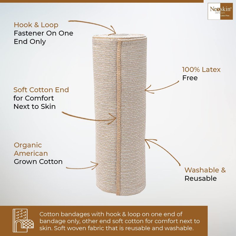 - 2 pack of Nexskin brand cotton bandages with single hook & loop closure produced with soft, woven fabric that is reusable and washable
