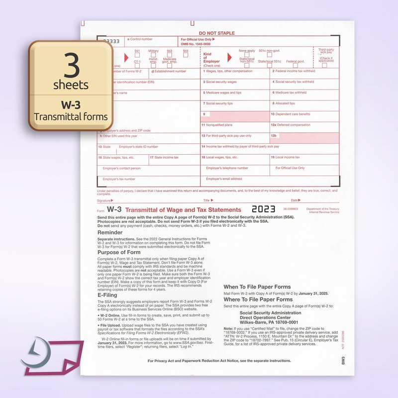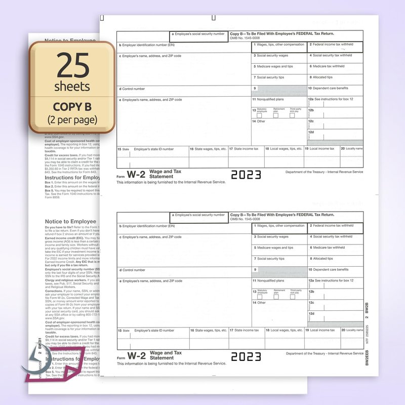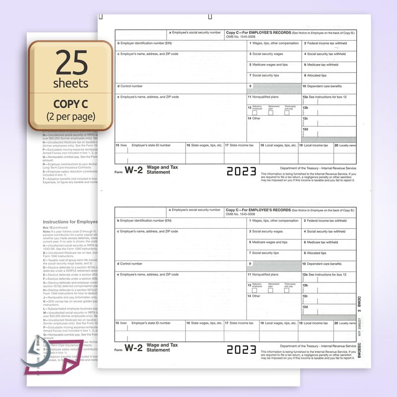 Our all-inclusive W-2 packet provides all the forms you need for quick, hassle-free filing. This is what you receive in the bundle: 50 copies of W2 Copy A (two forms per sheet - 25 sheets) 50 copies of W2 Copy B (two forms per sheet - 25 sheets) 50 copies of W2 Copy C/2 (two forms per sheet - 25 sheets) 50 copies of W2 Copy D/1 (two forms per sheet - 25 sheets) W3 Transmittal Forms | 50 Self Sealing Envelopes