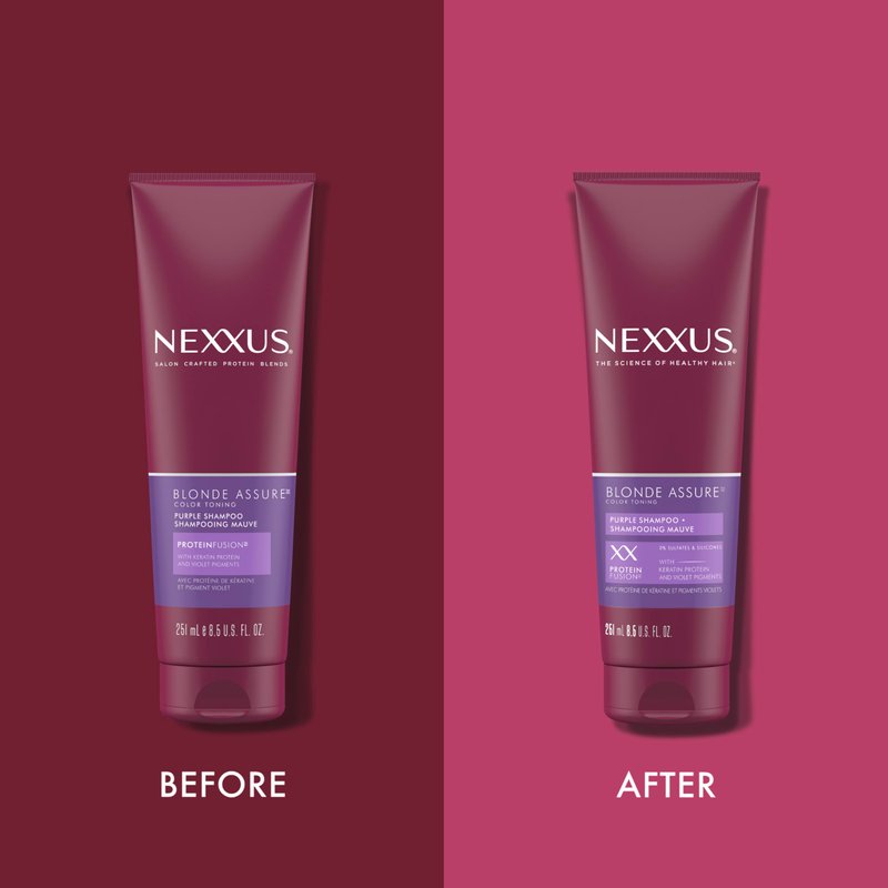 - PURPLE SHAMPOO TO BALANCE BRASSY TONES: Nexxus Blonde Assure Purple Shampoo for blonde, silver, or platinum hair helps neutralize brassy tones and provide long-lasting color care & color vibrancy