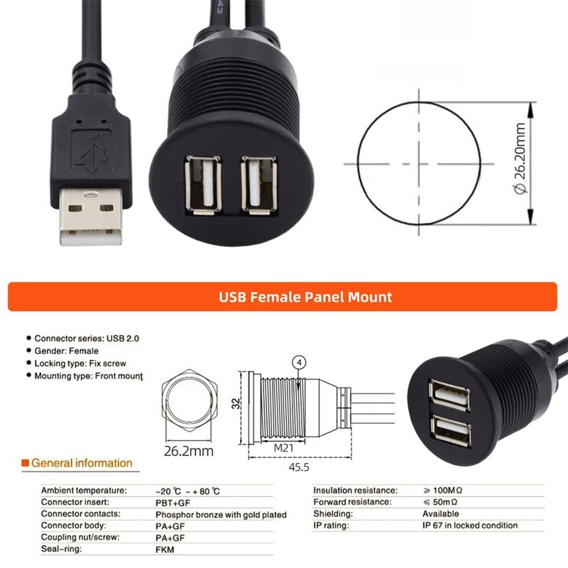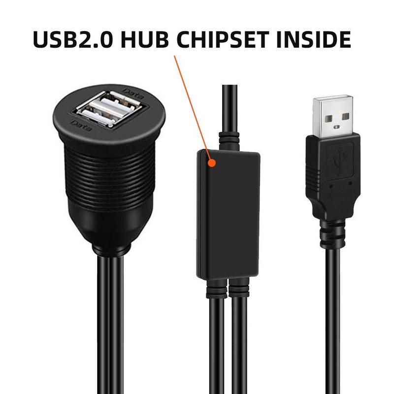 NFHK 1m Waterproof Dustproof 480Mbps USB2.0 Type-A Male to Dual Female Hub Extension Data Power Cable Car Panel Mount Design
