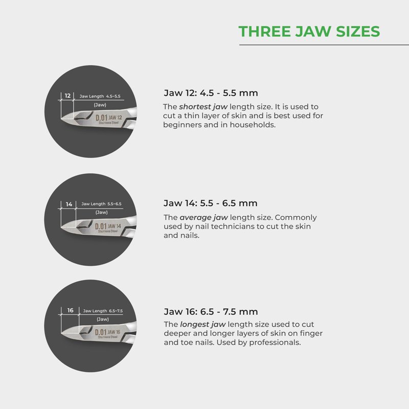 - JAW 14: The JAW 14 can perform deeper cuts and because it has a longer blade, it excude enough strenth to cut regular finger nails as well. The blades are shorter, allowing it to perform more shallow cuts. This jaw size is best used for beginner and less cuticle nails.