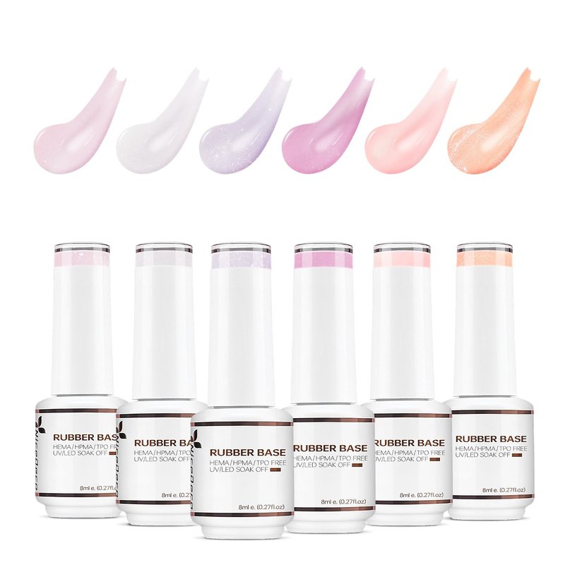 - Package Includes: 6 x Glitter Rubber Base Gel Nail Polish. (Volume: 8 ml / 0.27 fl.oz.e). To make it easier for you to choose your desired color, we have added color gel to the top of the cap, allowing you to view the color at a glance without opening the cap.