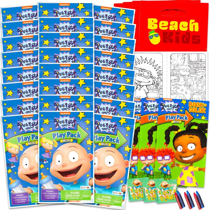 Crenstone Exclusive Nickelodeon Rugrats Mini Party Favors Set for Kids - Bundle with 24 Rugrats Reptar Play Packs with Coloring Pages, Stickers, More (Rugrats Birthday Party Supplies). This Rugrats birthday party supplies set features 24 mini Grab n Go Play Packs which each include a miniature coloring book, stickers, and coloring utensils. Sure to delight, Rugrats Play Packs are great to use as party favors, party supplies, goodie bag fillers, non-candy Halloween treats, trick or treat goodies, as part of a gift set and more. These Grab n Go Play Packs will pair perfectly alongside any other Rugrats merchandise featuring favorite characters from the show including Tommy Pickles, Angelica, Chuckie, Lil, Dill, Reptar and more. Officially licensed Nickelodeon Rugrats party favors for kids. Comes with bonus red Crenstone Exclusive Beach Kids loot bags.