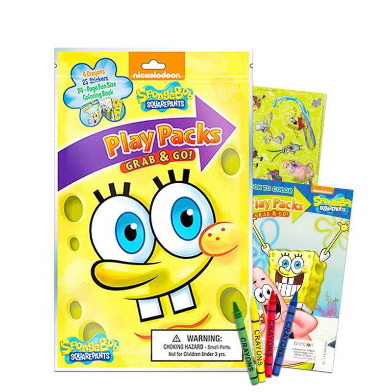 - Each individually-wrapped pack contains a fun-size Spongebob Squarepants coloring book, 25 Spongebob Squarepants stickers and 4 crayons. Perfect to hand out as Spongebob Squarepants party favors at birthday parties.