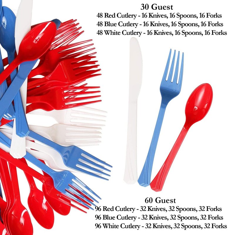 - 96 Red Cutlery - 32 Knives, 32 Spoons, 32 Forks + 96 Blue Cutlery - 32 Knives, 32 Spoons, 32 Forks + 96 White Cutlery - 32 Knives, 32 Spoons, 32 Forks