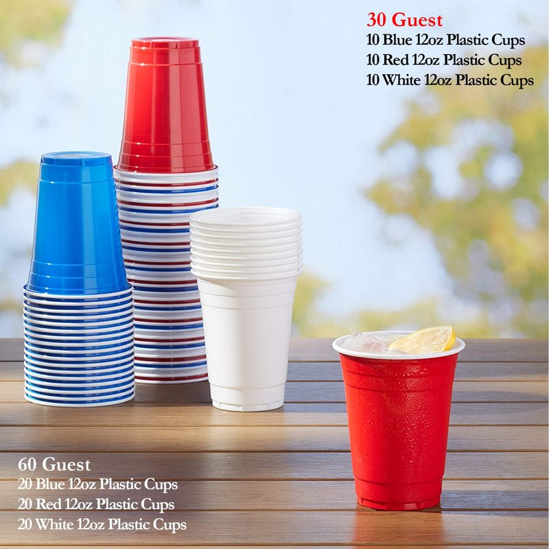 - 20 Blue 12oz Plastic Cups + 20 Red 12oz Plastic Cups + 20 White 12oz Plastic Cups