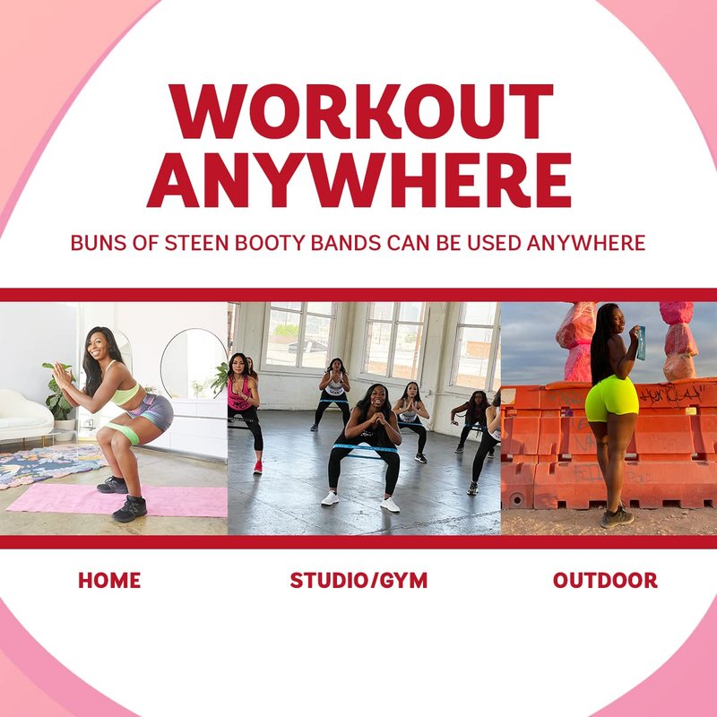 - WORKOUT ANYWHERE: Buns Of Steen Booty Bands can be used anywhere; do your resistance band booty workout at home, gym, in the park, beach, or even when traveling; simply roll them up and stick them in your gym bag, or your pocket, and you can workout whenever and wherever you like; these booty resistance bands can aid your exercise routine even in tiny spaces, as all you need is enough space to complete standard movements.