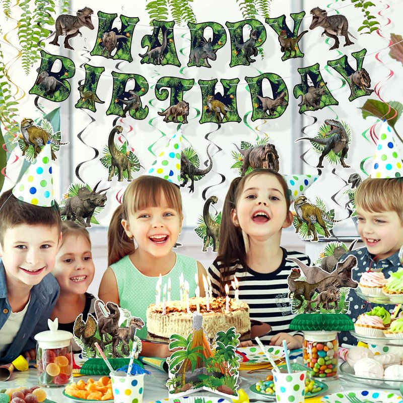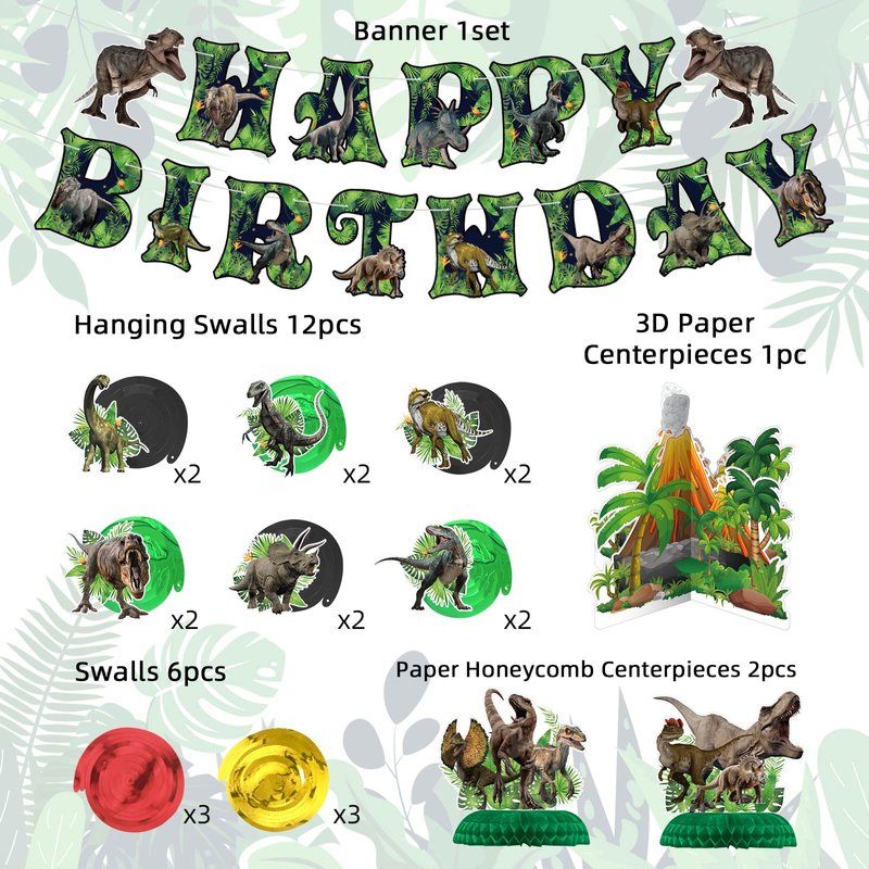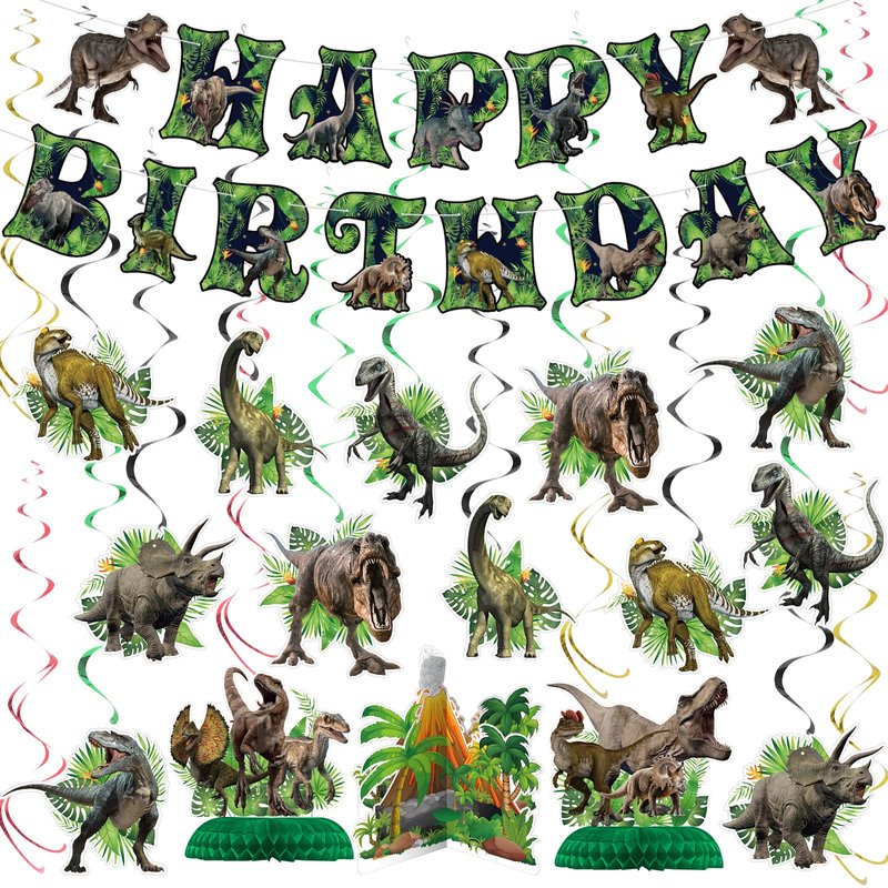 - Dinosaur Birthday Party Decoration Set: This party decoration set is perfect for a dinosaur-themed birthday party, with everything you need to create a fun and colorful atmosphere. The set includes a pre-assembled "HAPPY BIRTHDAY" banner, 12 hanging swirls, 6 double-ending swirls, and 3 honeycomb centerpieces.