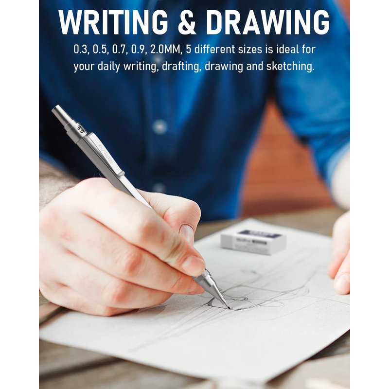 - Good Weight & Smooth Writing: The metal pencils have a full-metal body providing nice weight balance for fatigue-free writing and drawing. The mechanical pencil is pre-loaded with 0.3, 0.5, 0.7, 0.9, 2.0 lead, never needs sharpening, is super strong & smooth, produces a clear dark line.