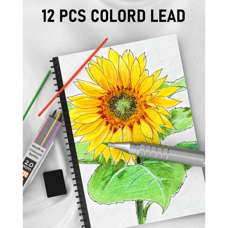- Colored Lead: Nicpro colored mechanical pencils come with 12 pieces 2.0 mm colored refills that change color meet your different needs. Extra 2pcs lead sharpener are provided for the 2.0 lead to keep the fine point as they dull.