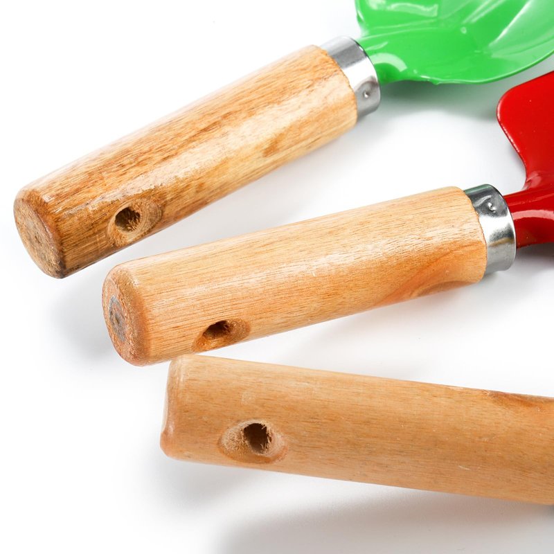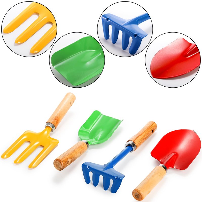- All garden tools are constructed of high-quality metal, with a durable wooden handle. They have rounded edges to ensure Safety for kids.