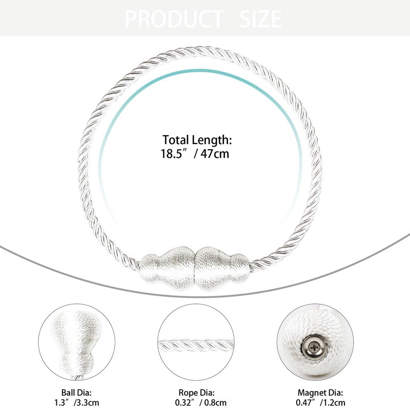 - Adjust Length Freely- Total Length - 18.5", Rope Diameter- 0.32". Ball Diameter- 1.3". Suitable for most curtains/drapery, you could be twisted to adjust the length to meet your need, so no need to worry about the size is too big, You can wind it twice or use it directly. also suit for small curtains, thin curtains, sheer curtains.