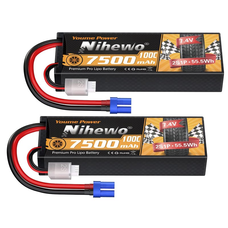 - 【What You Get】-2 Packs x Nihewo 2s lipo battery EC5 plug 7.4v 7500mAh 100C hard case rc lipo