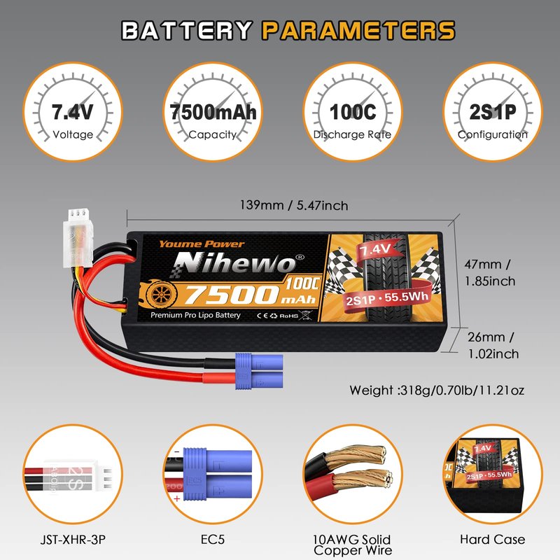 - 【2s Lipo Specification】-Nihewo 7.4v Lipo Battery Material: Lithium polymer;Battery Voltage: 7.4V;Cell: 2S;Capacity: 7500mAh; Configuration: 2S1P; Cell voltage: 3.2~4.2V;Discharge: 100C; Charging Plug: JST-XHR-3P; Discharging Plug: EC5 Connector(Compatible with IC5 plugs);Pack: Hard case