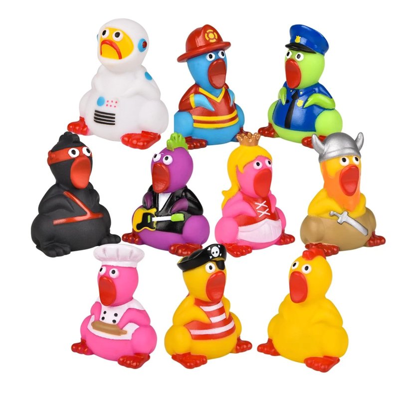 - PACKAGE INCLUDES: You will receive 10 rubber chicken toys. They come in bright eye catching colors and costumes including fire fighters, police officers, vikings, astronauts, ninjas, rock stars, pirates, and more!