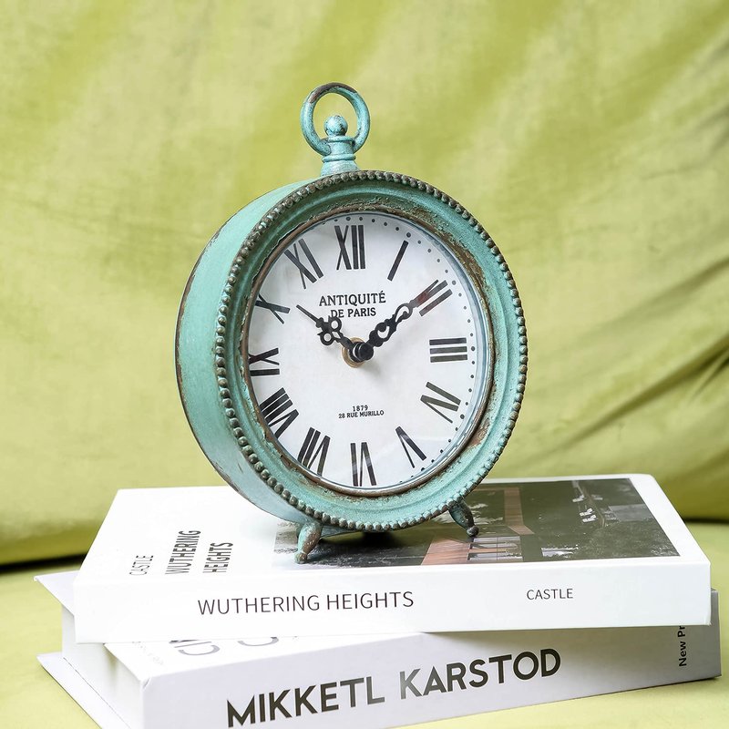 NIKKY HOME Antique Table Clock Silent Non-Ticking, Shelf Desk Top Clock Battery Operated Rustic Distressed Design, Shabby Chic Home Decor for Fireplace Mantel, Desktop, Countertop- Green