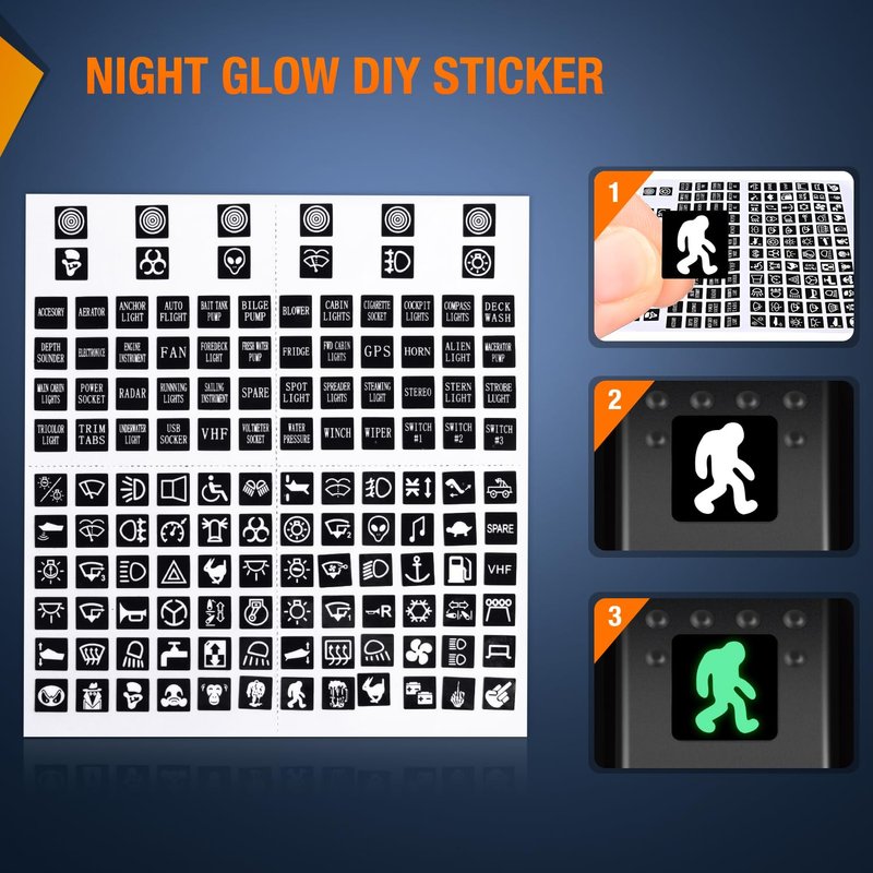 - DIY As You Like: Package comes with a set of normal stickers and a set of night glow stickers. With various patterns and words which meet your DIY needs and help you find the switch in the dark easily. Best match with wiring harness for controlling lighting of Led Light Bar, Led Work Lights, Fog Lamps, Headlights, Taillights and Auxiliary Lamps, etc