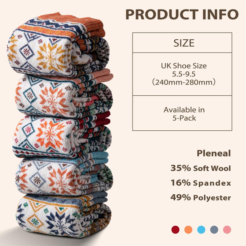 - 🦶 HIGH QUALITY: 5 Pairs Wool socks are made of high-quality wool, cotton, polyester fiber and other materials. The fabric is breathable, sweat absorbing, comfortable and non slip. Make you experience Ultra Plush softness and flexibility.