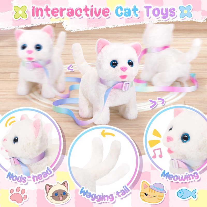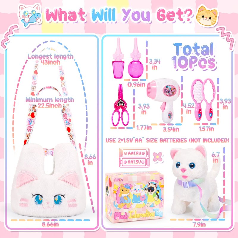 - Cat Toys for Kids: Ready for new companions! The cat plush set includes 1* electric cat with leash, 1* tote bag with shoulder strap, 1* hair dryer,1* scissors,1* mirror,1* comb and 2* cleaning supplies. Let your child pretend to take care of their pet friend, take a walk together and enjoy the fun of raising a pet