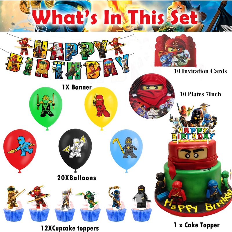 - What You Will Get: 1 set of happy birthday banner, 18 pcs latex balloons(3 design), 1 pcs cake topper, 12pcs cupcake topper(6 styles), 10 pcs 7inch plates, 10 pcs Invitation Cards. Our full set of ninja birthday party supplies will add surprises to you, your family and friends.