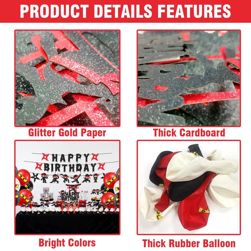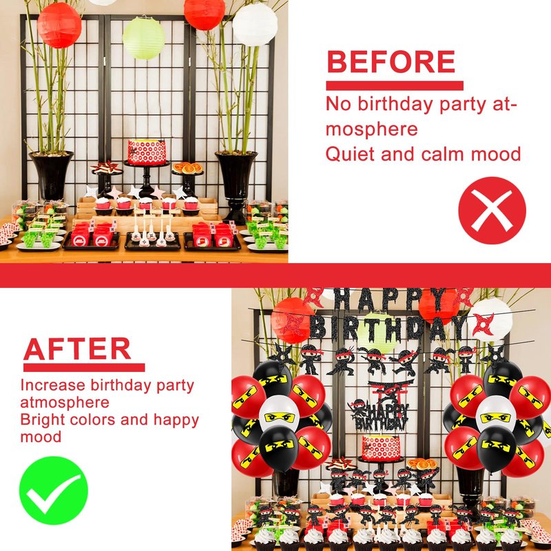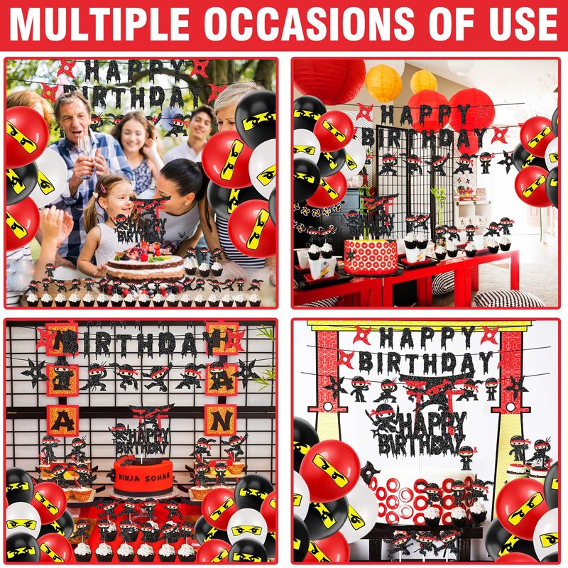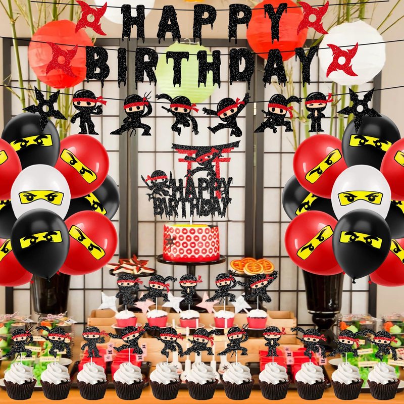 - 🎈【Ninja Themed Birthday Decoration Set】1 * Ninja Happy Birthday banners + 1 * Ninja happy birthday cake toppers + 24* Ninja themed cupcake toppers + 24 * 12in balloons.(8 * red balloons + 8* black balloons +4 * white balloons )