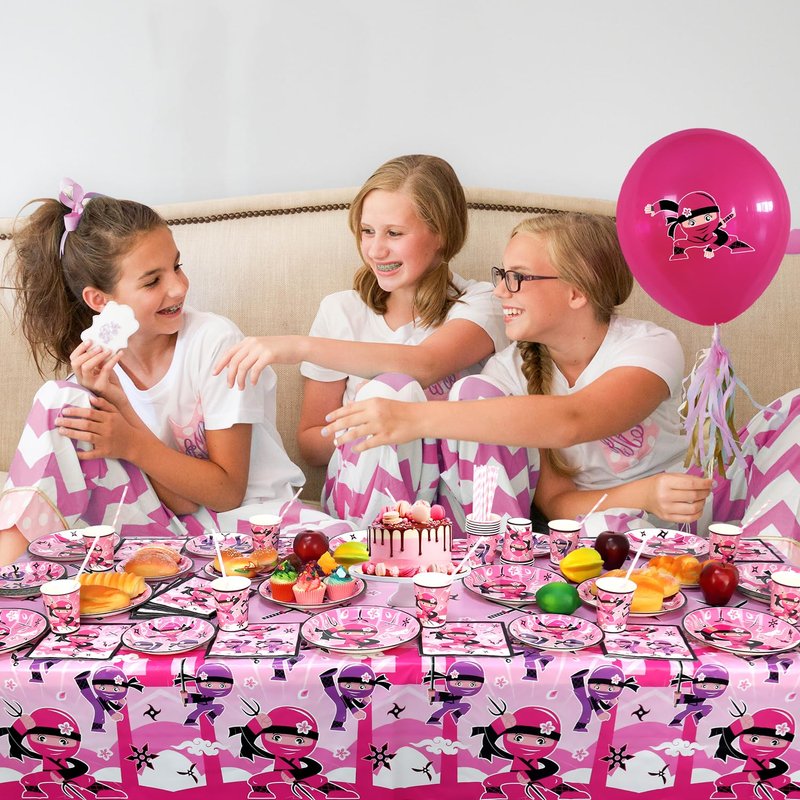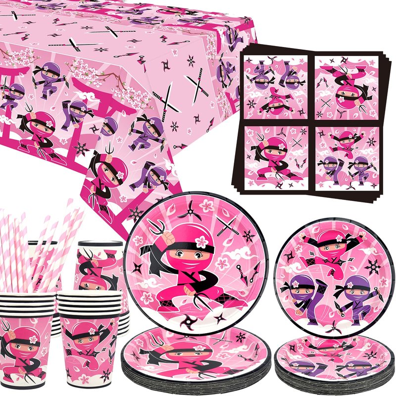 - Ninja Birthday Party Pack for Girls: 20PCS 9" dinner plates + 20PCS 7" dessert plates + 20PCS 9oz paper cups + 20PCS napkins + 20PCS straws + 1PC Ninja table cover. Tablecloth Size: 86 x 51 inches ( 220 x 130cm ).