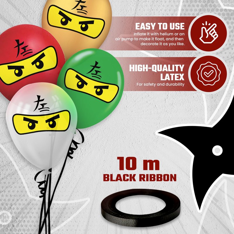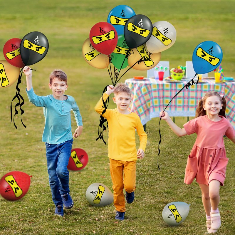 - Ninja Themed Party Balloons: Includes a set of 30 assorted color balloons perfect for ninja birthday decorations. These vibrant party balloons add a fun touch to any ninja birthday party.