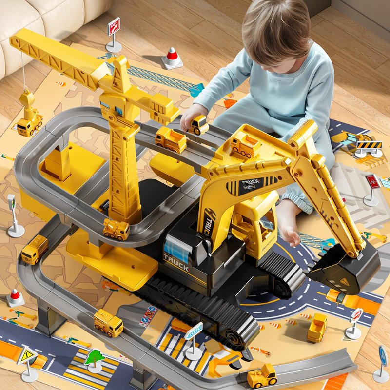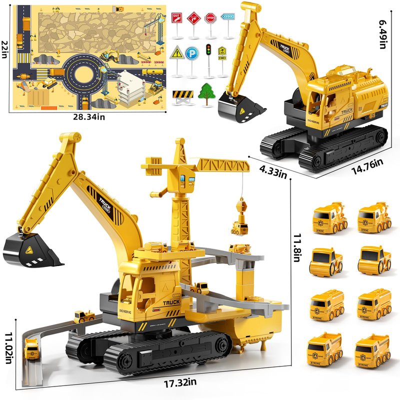 - 2 In 1 Construction Excavator Set - The trucks toys are designed for crane and excavator toy race track.It is also a large excavator, 8 small vehicles (2 tankers, 2 cement, 2 dump and 2 road rollers) , a map and track, providing endless fun for kids 3-8 year old.