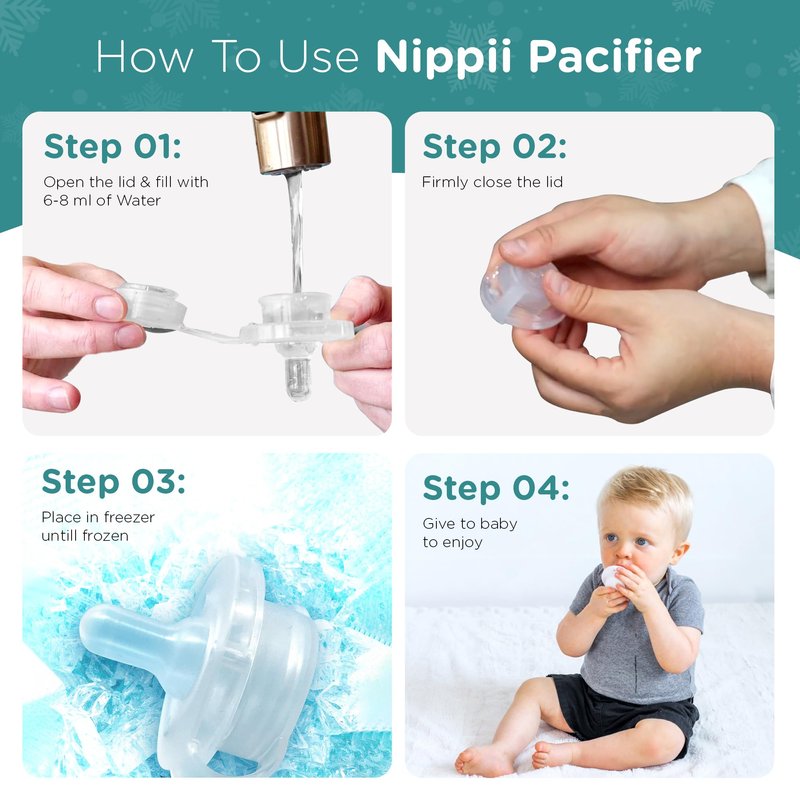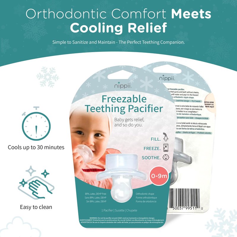 - Revolutionary Cooling Design: Nippii Freezable Orthodontic Pacifier for teething offers soothing relief for your baby’s gums. This orthodontic teether pacifier provides a gentle cooling effect that alleviates teething pain without irritating your baby’s cheeks, face, or hands. Simply fill it with water and pop it in the freezer. Baby gets relief and so do you.