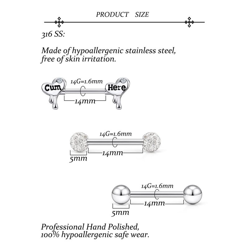 - [PRODUCT SIZE]: Piercing Needles: 14G=1.6mm, Nipple Rings :14G=1.6mm, Color: Silver.