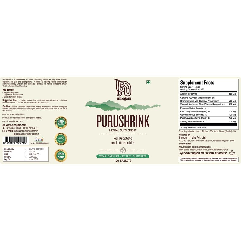 Nirogam Purushrink Bladder Herbal Supplement for Men | Natural Ayurvedic Formula 120 Tablets