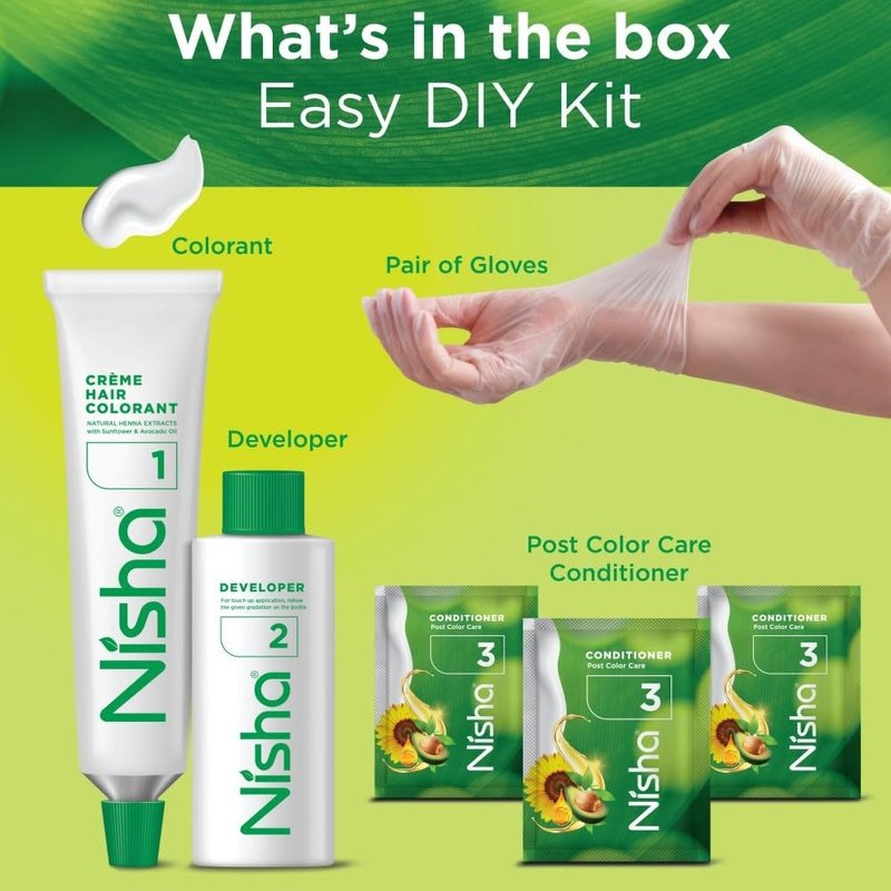 - Package includes- 3 Nisha 60ml Developer Bottle, 3 Nisha hair colorant 60gm Tube, 3x3 Conditioner 6ml/each, 3 pair hand gloves and 3 manual for home use.