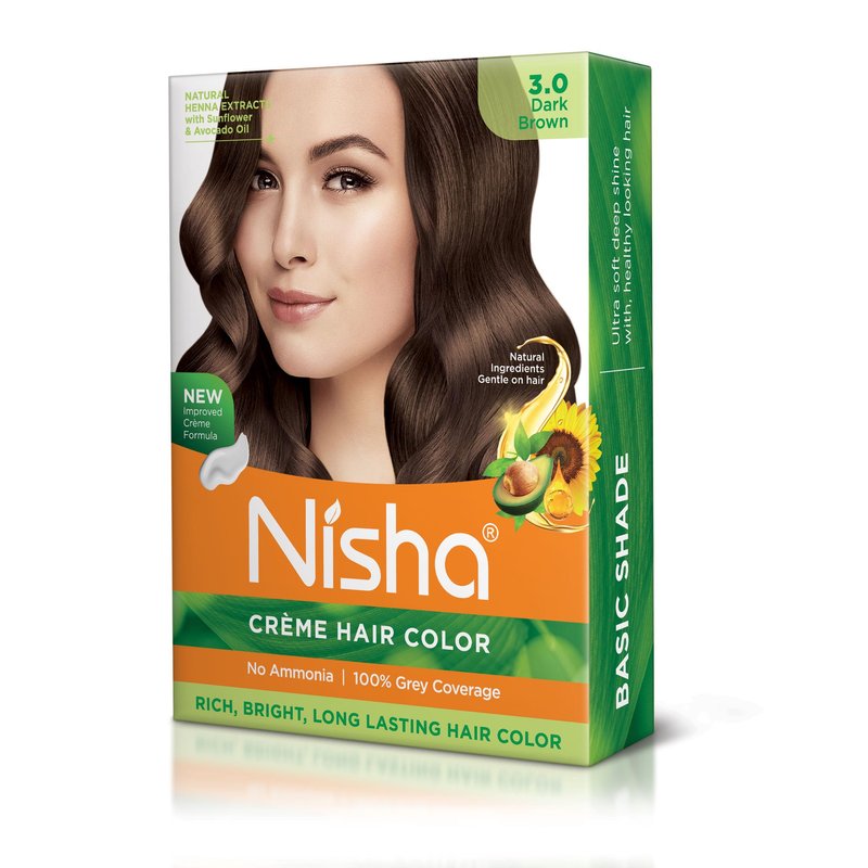 Nisha Crème Hair Color is a crème-based hair color with the benefits of Sunflower, Avocado and Henna extracts, these herbs constitute a perfect blend for hair color. Nisha crème hair color not only covers your grey hair but also makes your hair soft, silky and stylish. This rich, bright & long lasting color is available in 18 beautiful shades. All shades are Ammonia free except Fashion/Blonde Shades