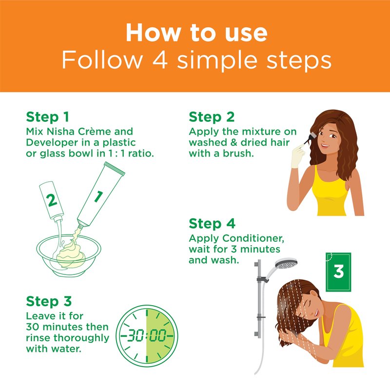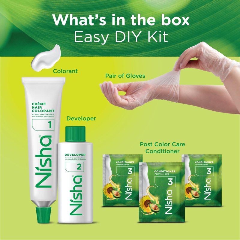 - Package includes- 3 Nisha 60ml Developer Bottle, 3 Nisha hair colorant 60gm Tube, 3x3 Conditioner 6ml/each, 3 pair hand gloves and 3 manual for home use.
