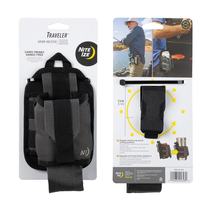 Nite Ize Traveler Drink Holster - Traveler & Water Bottle Holder for Hands-Free Use - Drink Pouch Holster for Waistbands & Belts - Adjustable Beverage Holder with Rotating Clip - Black