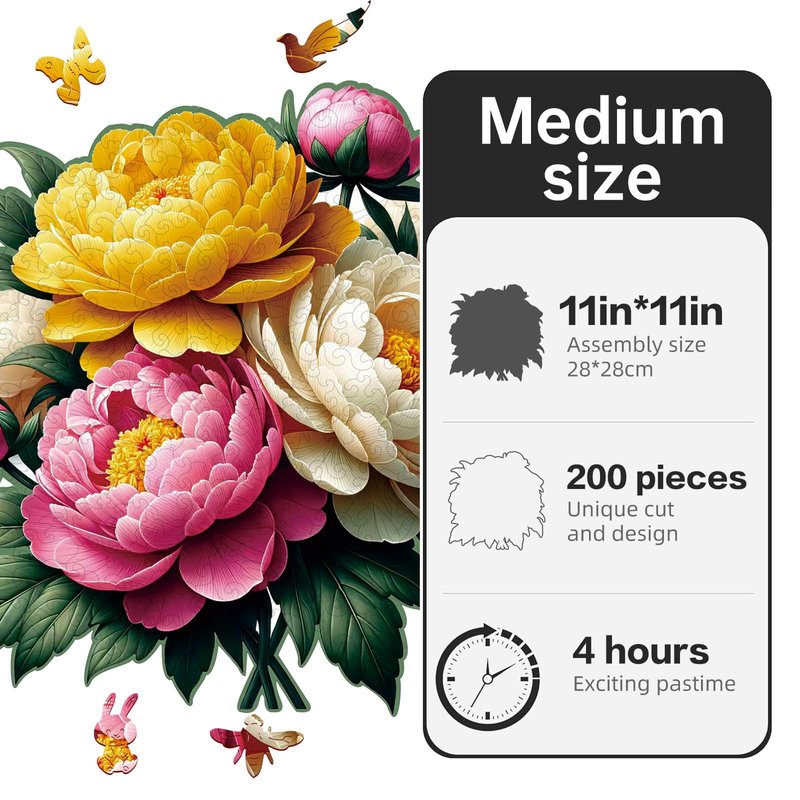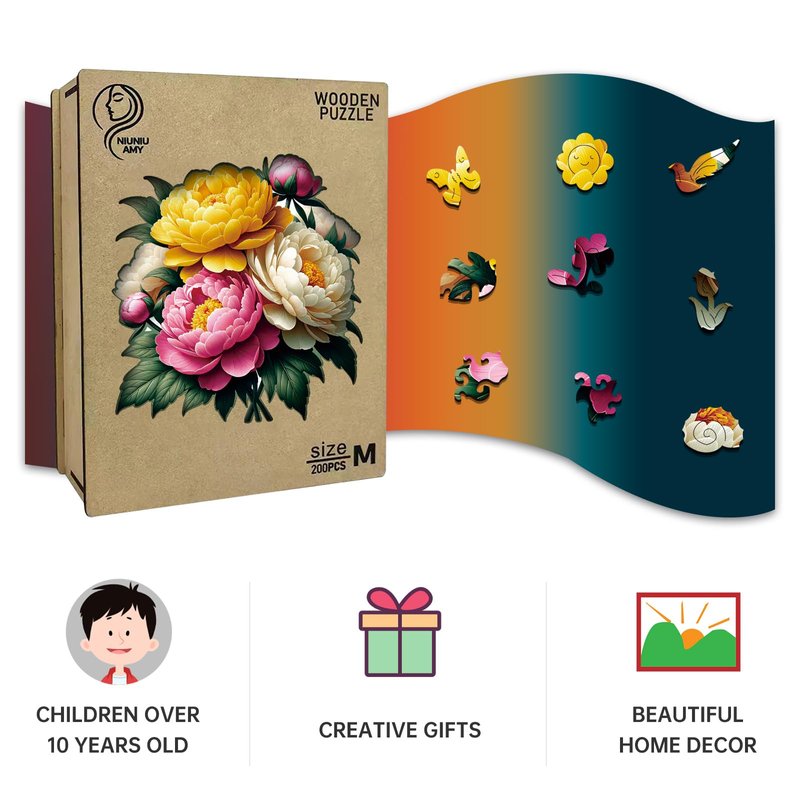NIUNIUAMY Wooden Puzzle, Multi-Color Peony Flower, Adult Wooden Puzzle, Colorful Wood Carving Puzzle Designed for Family and Friends, 11 * 11 inches, 200 Pieces (Medium)